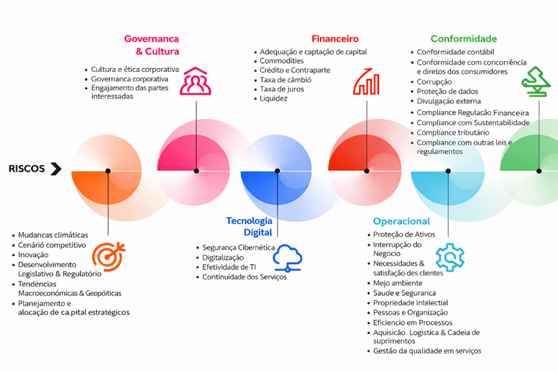 Esse modelo se baseia em uma série de “pilares” e em uma taxonomia de riscos uniforme, também conhecida como “Catálogo de Riscos”, que facilita a gestão de riscos e uma representação consistente em todas as regiões geográficas e linhas de negócios. O Catálogo de Riscos agrupa os riscos em seis macrocategorias – estratégico, financeiro, operacional, conformidade, governança e cultura, e tecnologia digital – e 38 subcategorias, em linha com o padrão do Grupo Enel.