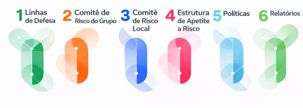 - Linhas de defesa: o modelo está estruturado em três linhas de defesa para atividades de gestão, monitoramento e controle de riscos, em conformidade com o princípio da segregação de funções. A primeira linha (áreas de negócios e corporativas – Responsáveis pelos Riscos) identifica e gerencia os riscos nas operações diárias e mantém controles internos eficazes; a segunda linha (Controle de Riscos e outras funções de controle) define metodologias, monitora limites e apoia planos de mitigação; e a terceira linha (Auditoria Interna) avalia de forma independente a eficácia do SCIGR e se reporta diretamente aos Conselhos.